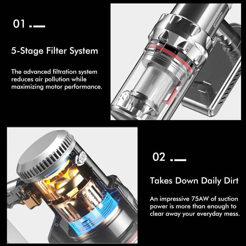 With 5 stages fully sealed cyclone filtration system, the vacuum cleaner cordless captures 99% of fine
