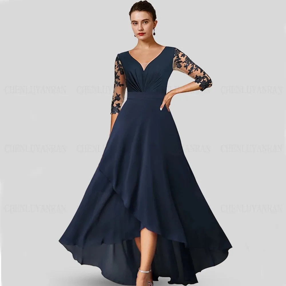 Chiffon Mother Of The Bride Dresses 2023 V Neck Lace Applique Wedding Guest Gowns A Line 3/4 Sleeves Robe De fête De Mariage